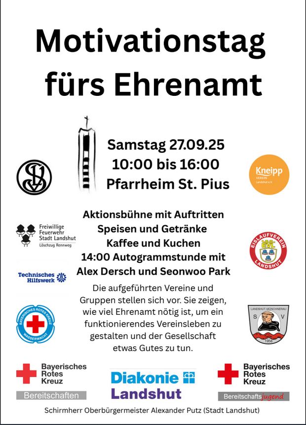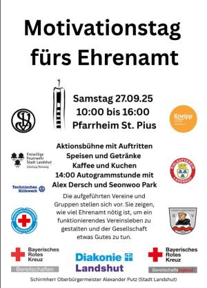 Am Samstag, 27.09.2026 findet beim Pfarrheim St. Pius in Landshut West ein Motivationstag für das Ehrenamt statt.
